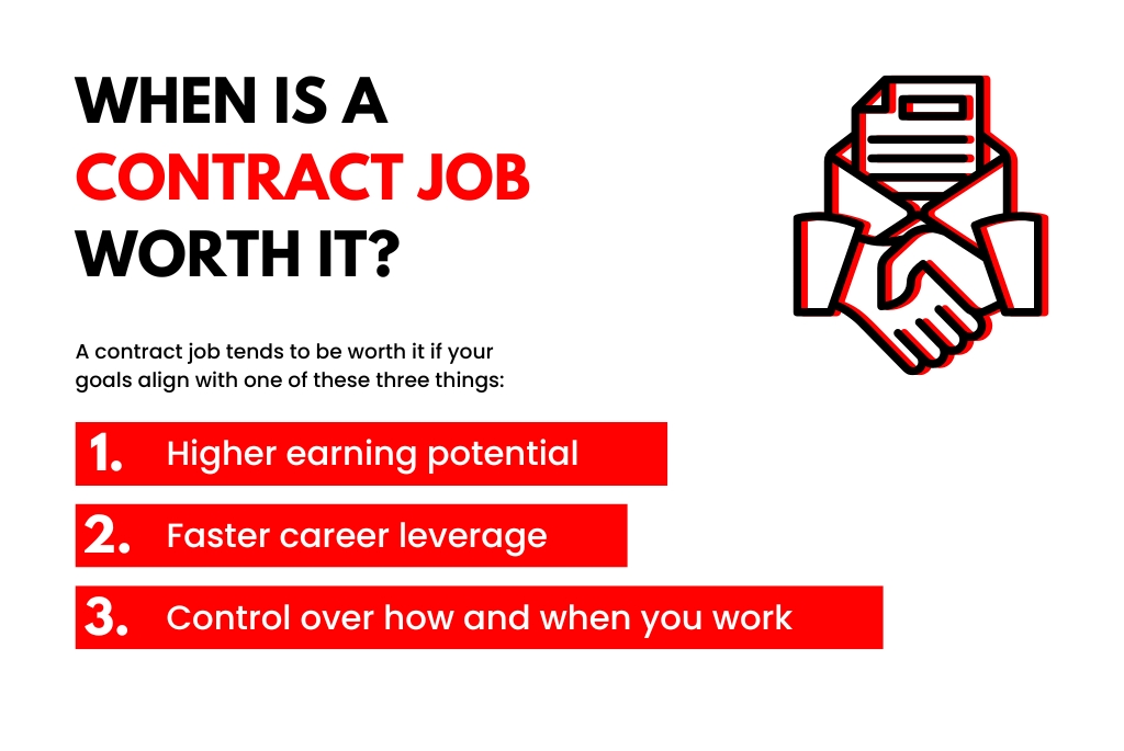 Contract roles often make sense when the pay increase is large enough to replace benefits and cover gaps between projects, or when the role provides access to skills, industries, or leadership exposure that would take years to reach in a traditional full-time path.