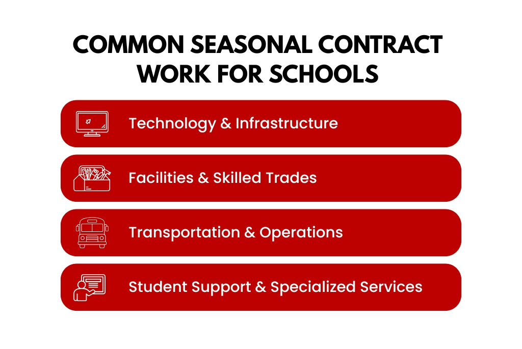 In practice, seasonal contract work in schools tends to cluster around four categories: