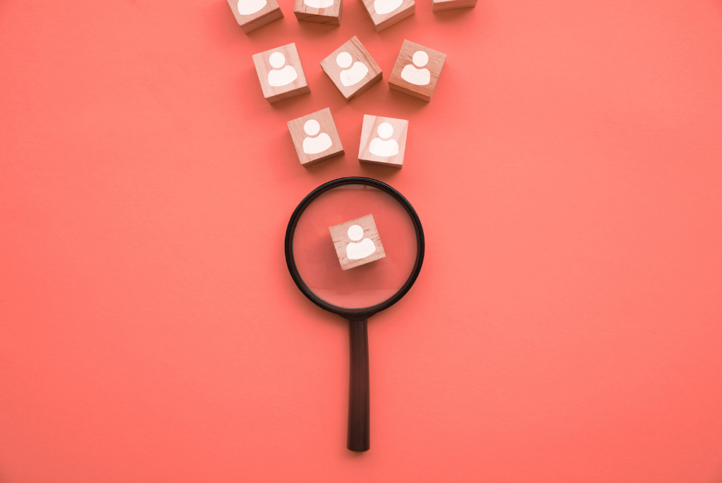 Magnifying glass hovering over wood block with person on it