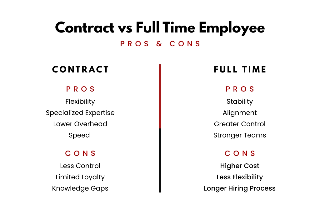 Contractors often bring deep expertise for niche or short-term needs.